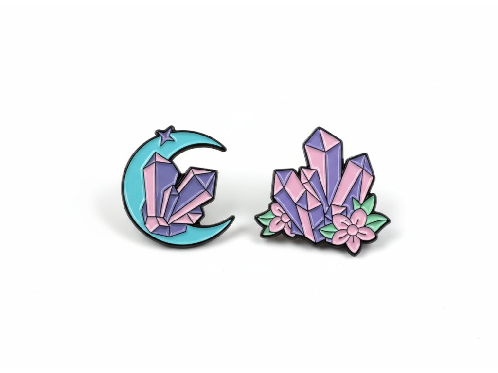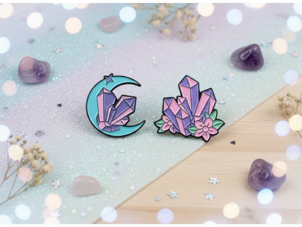 Tato sada pinů s motivy krystalů přináší kouzelný dotek mystiky a elegance! 🌙✨ Modrý měsíc s hvězdou a růžovými krystaly, doplněný o křišťálový shluk s květinami, vytváří design, který zaujme milovníky přírody i esoteriky.